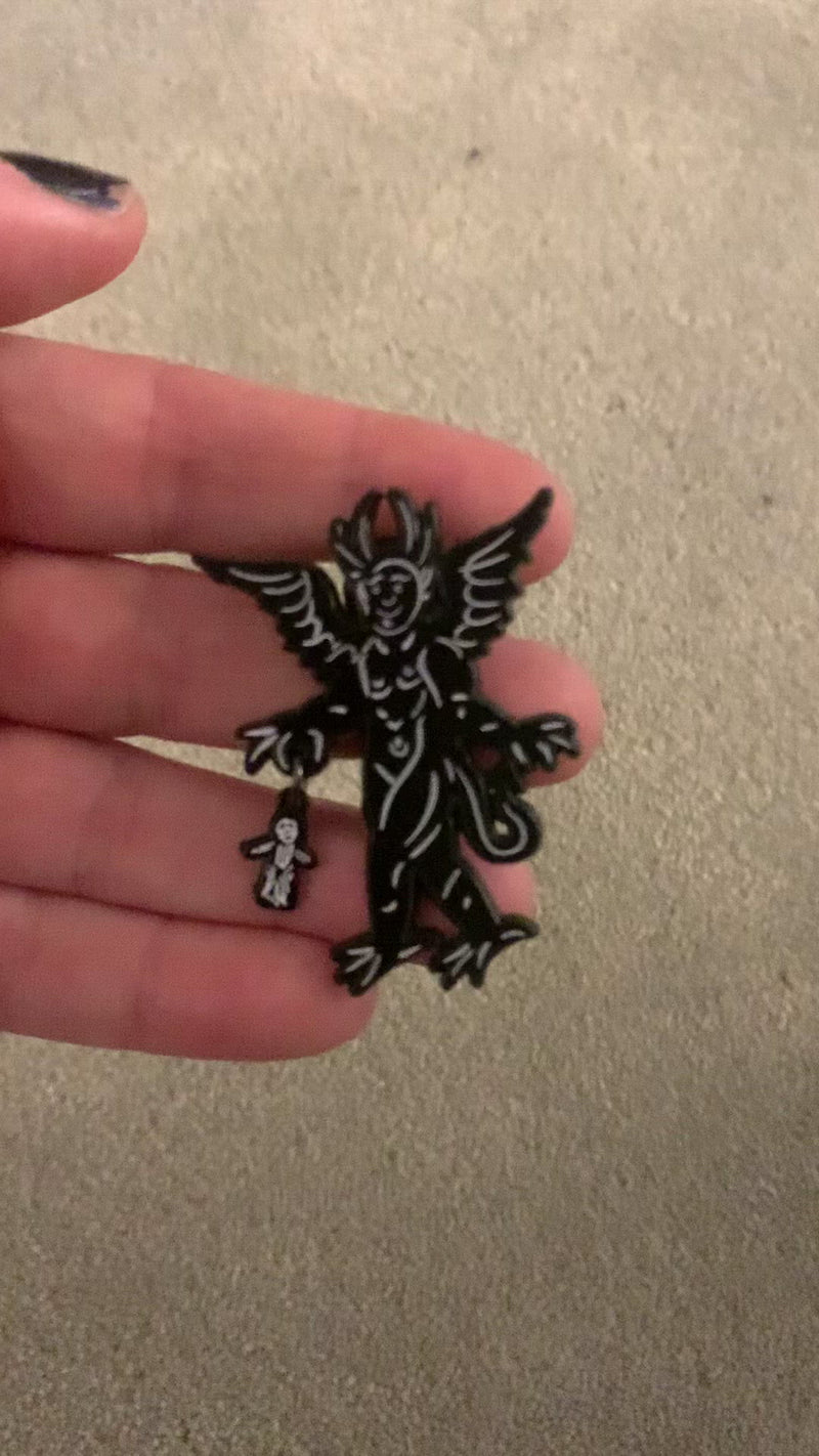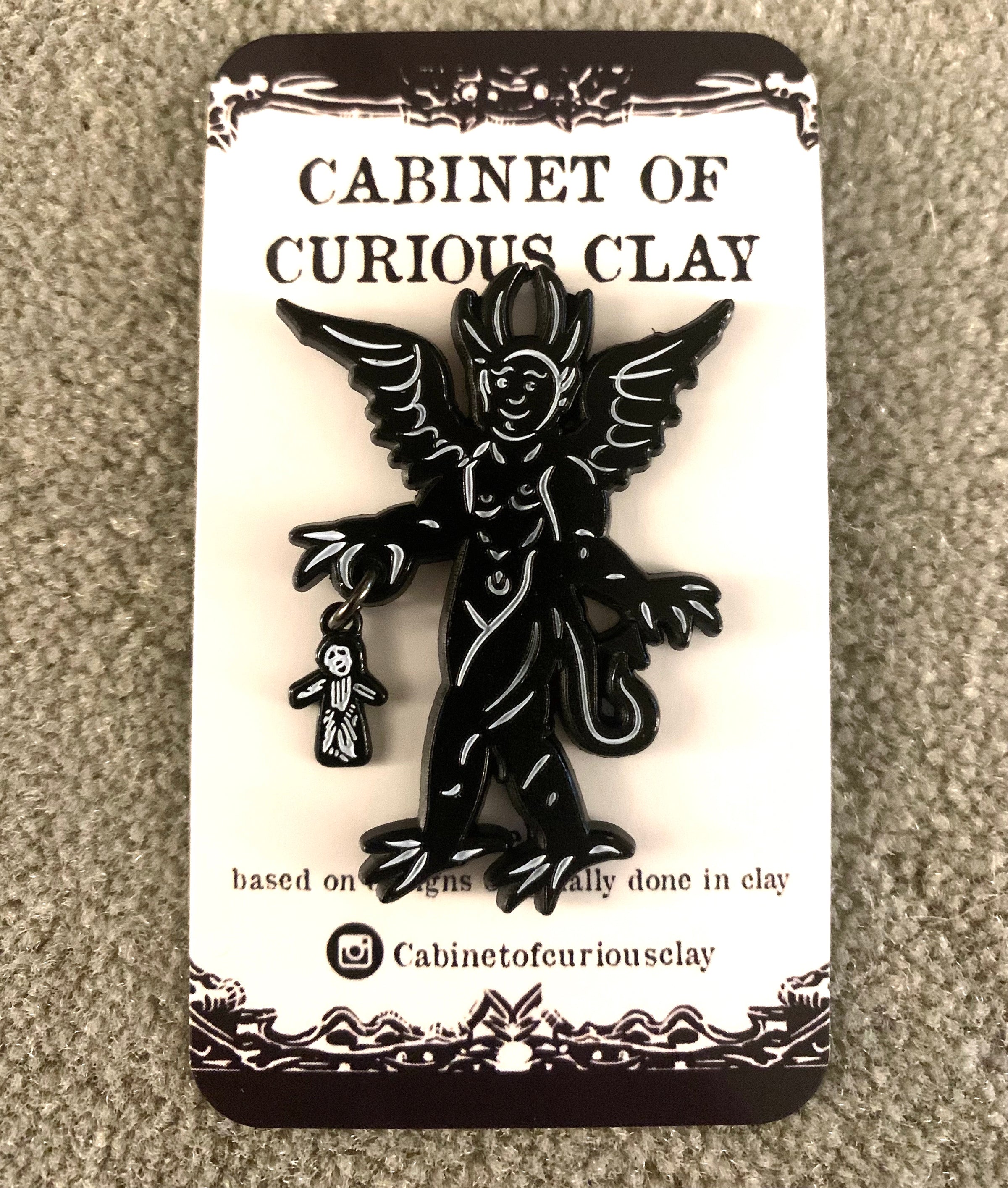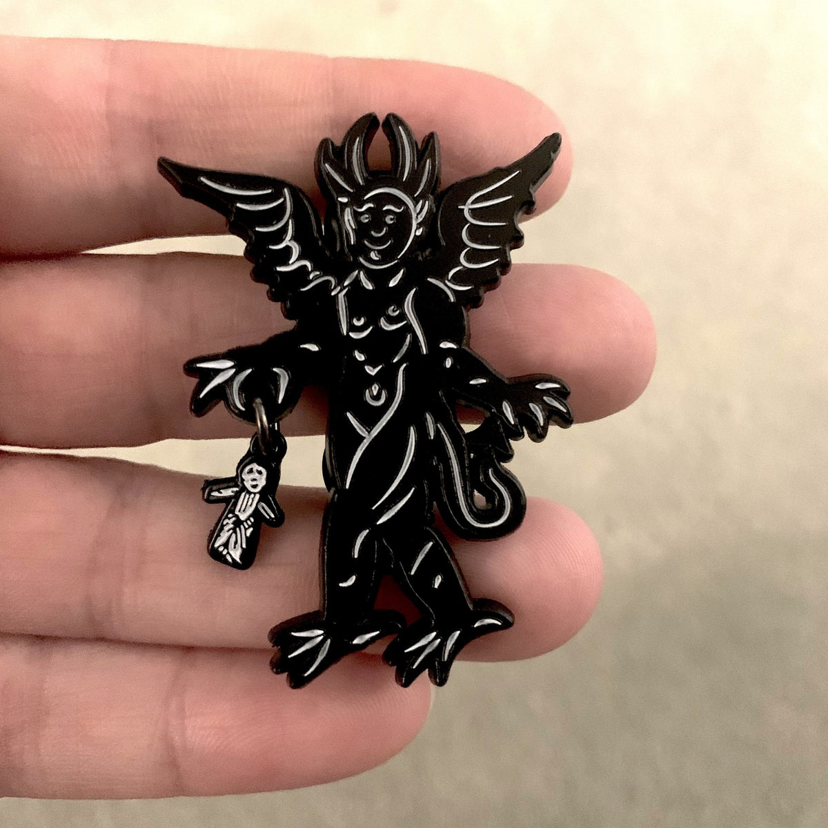 This enamel pin is based on a historic woodcut design of a devil and dangling from his hand is a poppet gifted to him by a witch. I also put this design on my pottery!