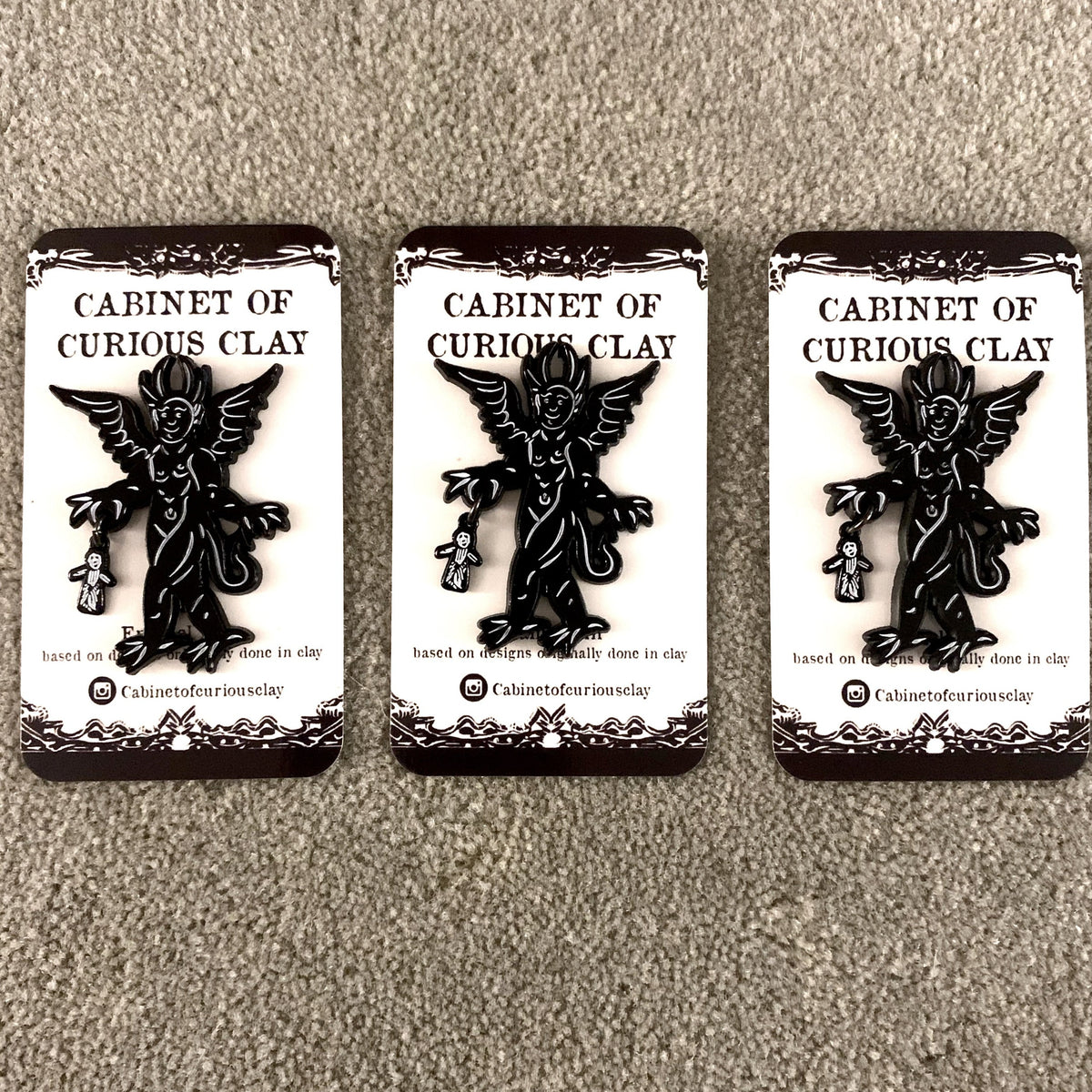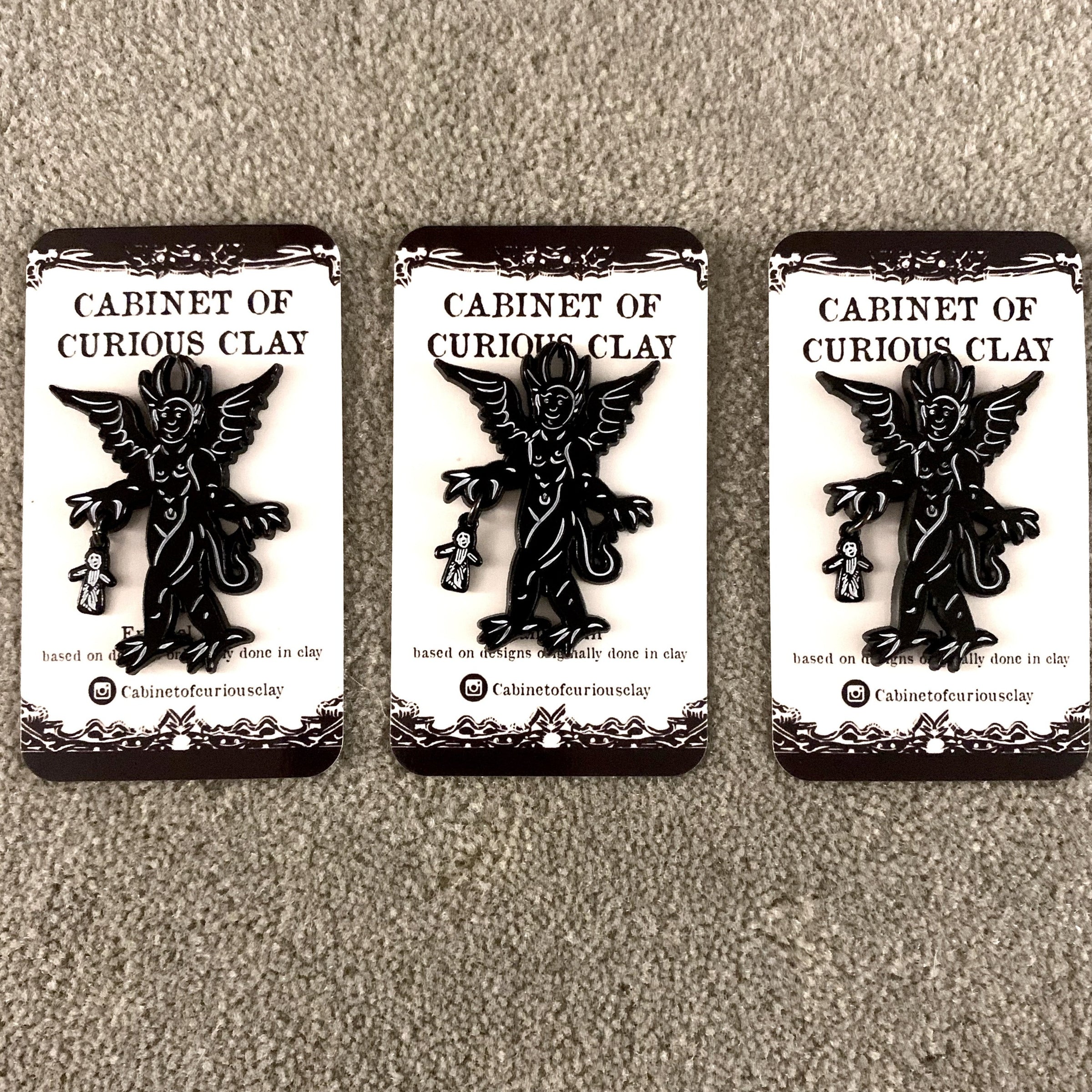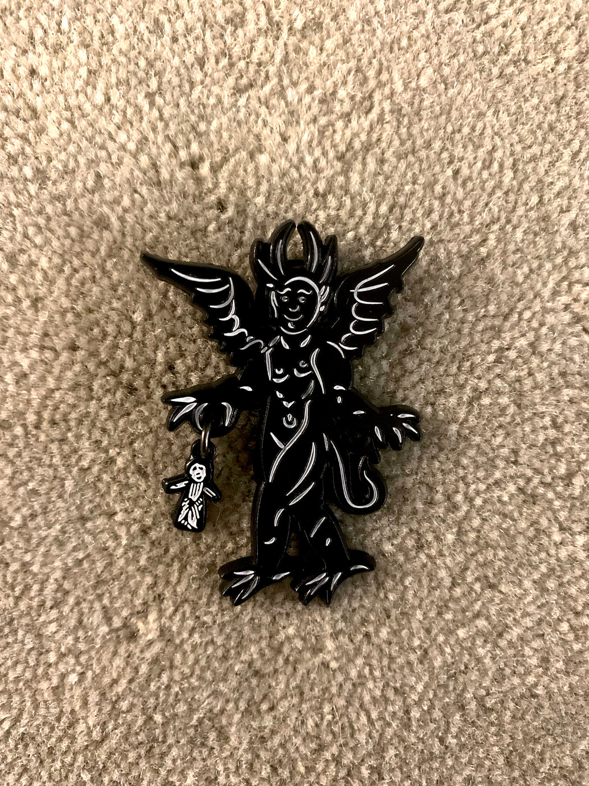 This enamel pin is based on a historic woodcut design of a devil and dangling from his hand is a poppet gifted to him by a witch. I also put this design on my pottery!