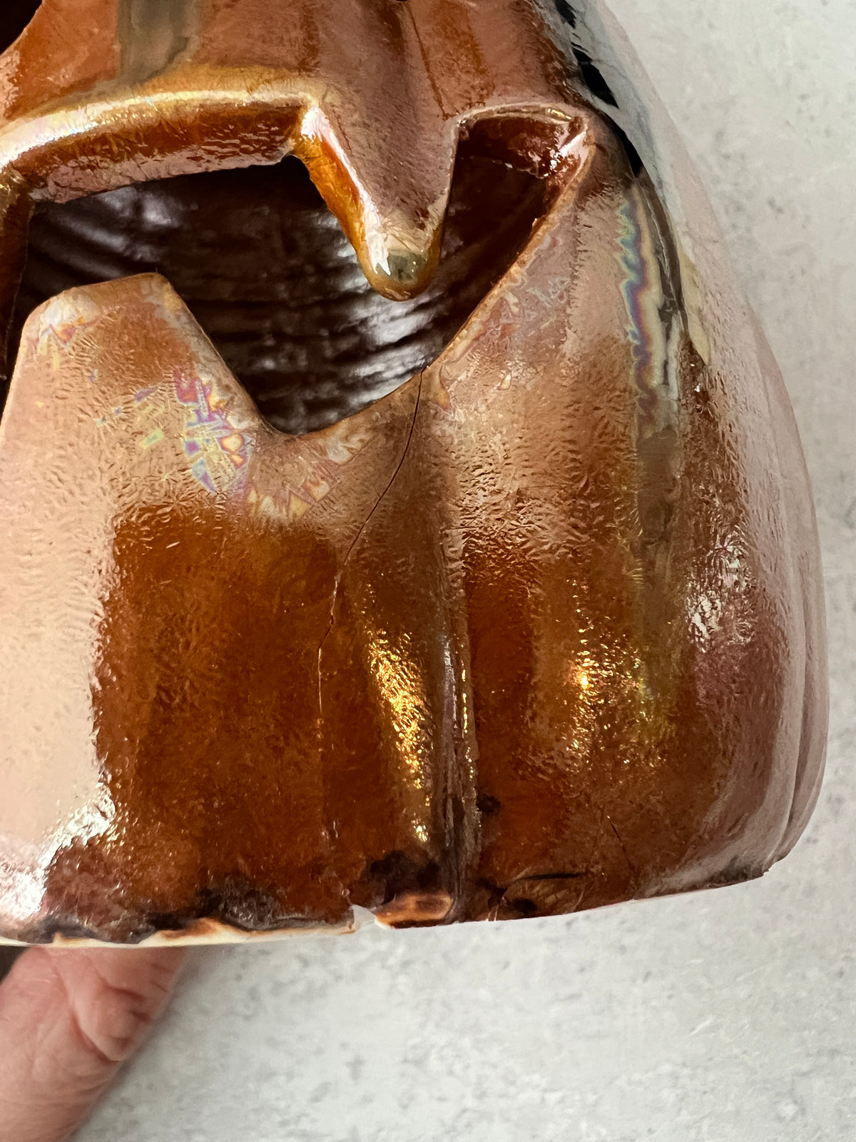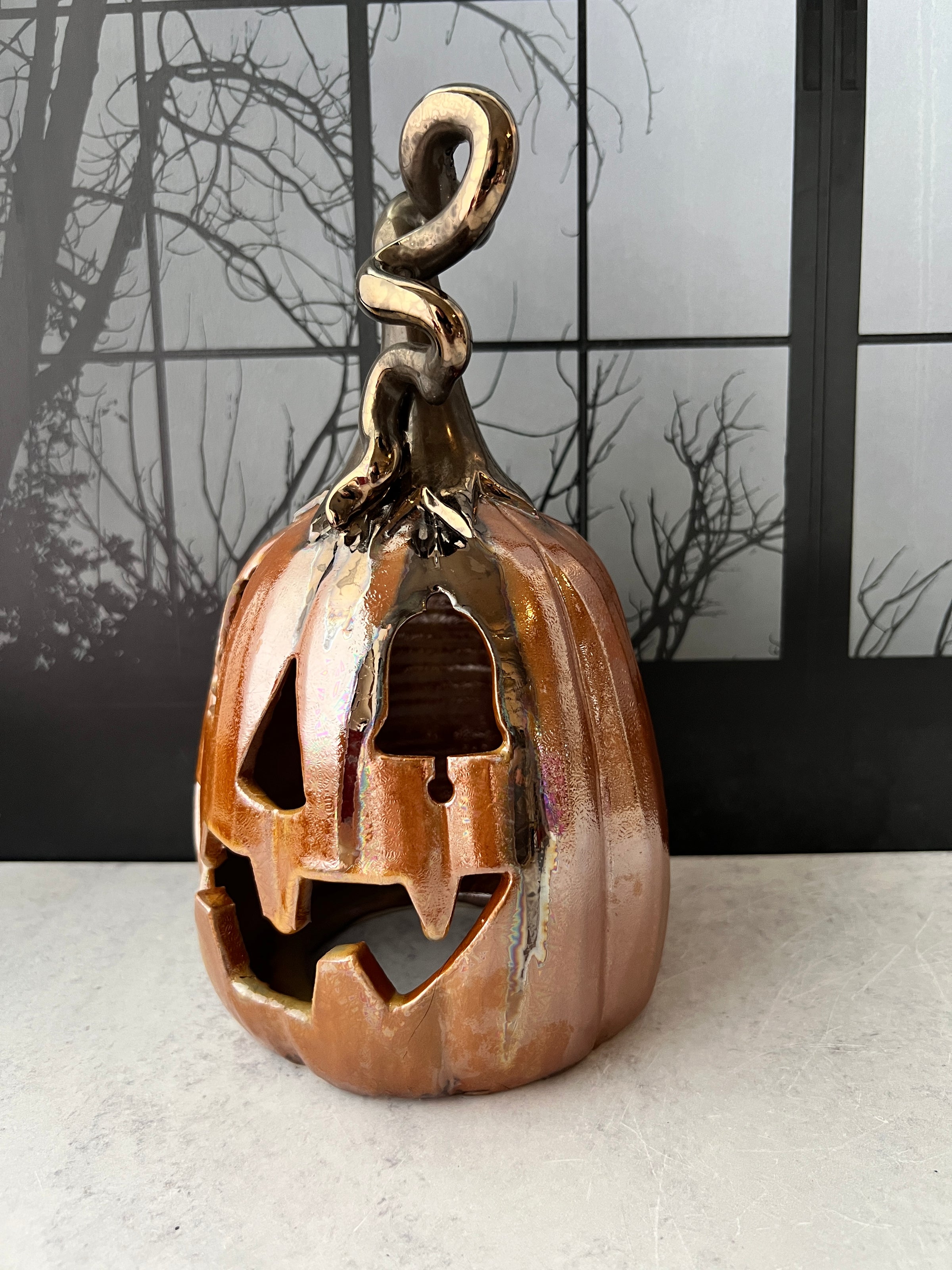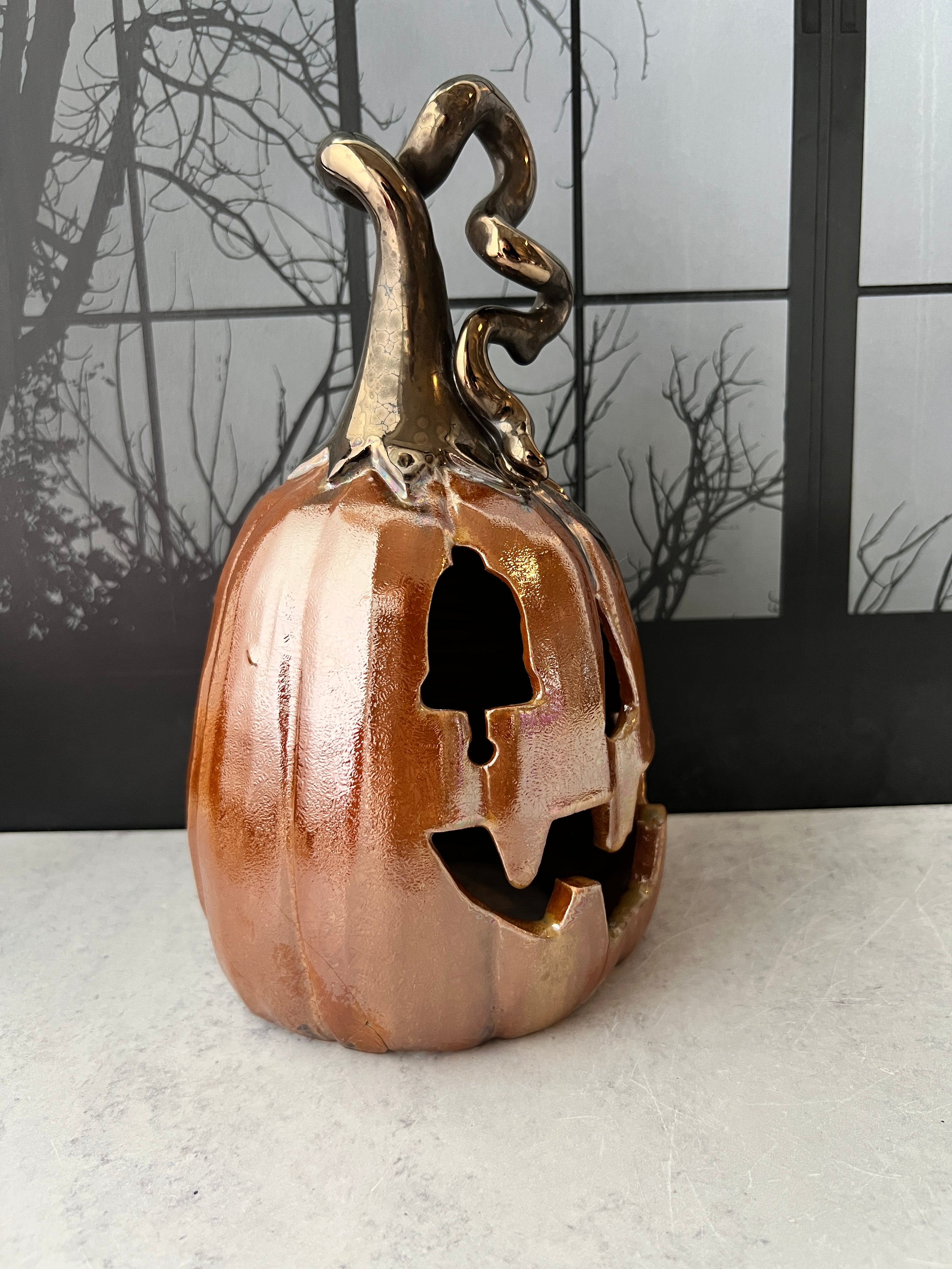 This Jack o'lantern is damaged and therefore discounted. Please see the last photos. A large piece of the mouth broke off, I glued it back on with a 2 part epoxy. There's also one small area on the side I glued a piece back on.
