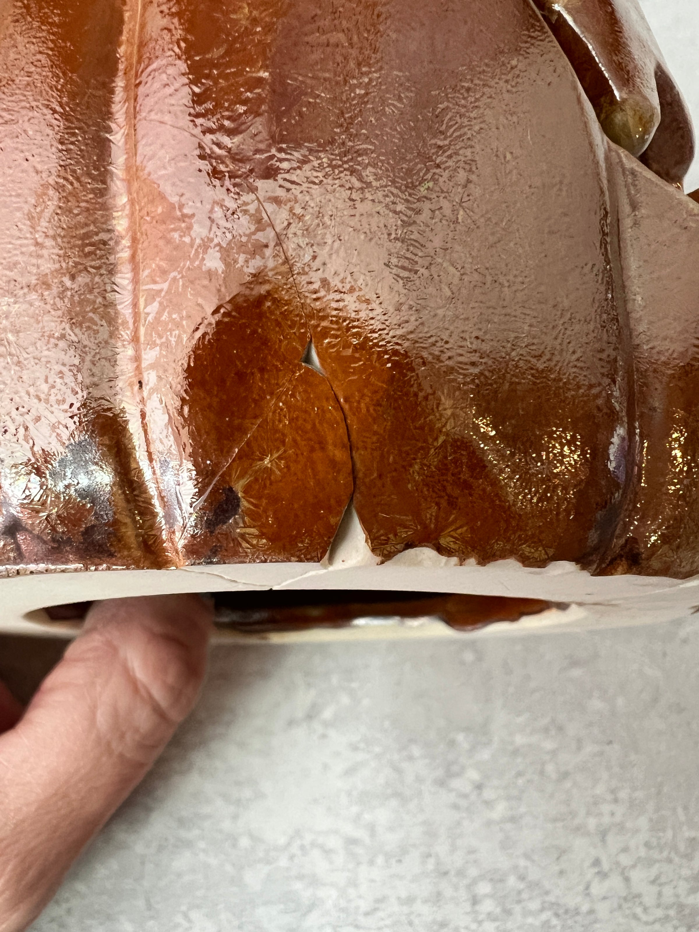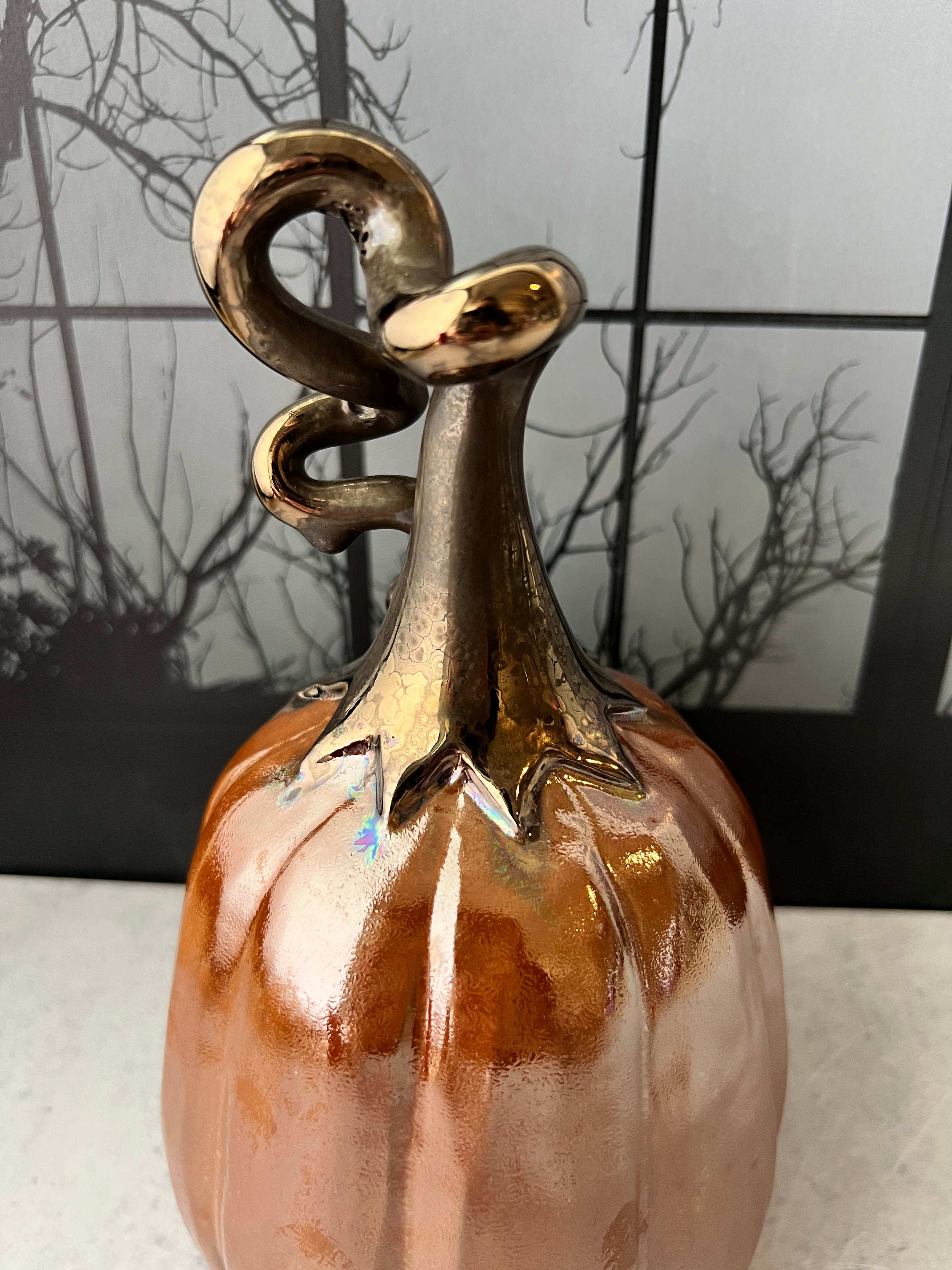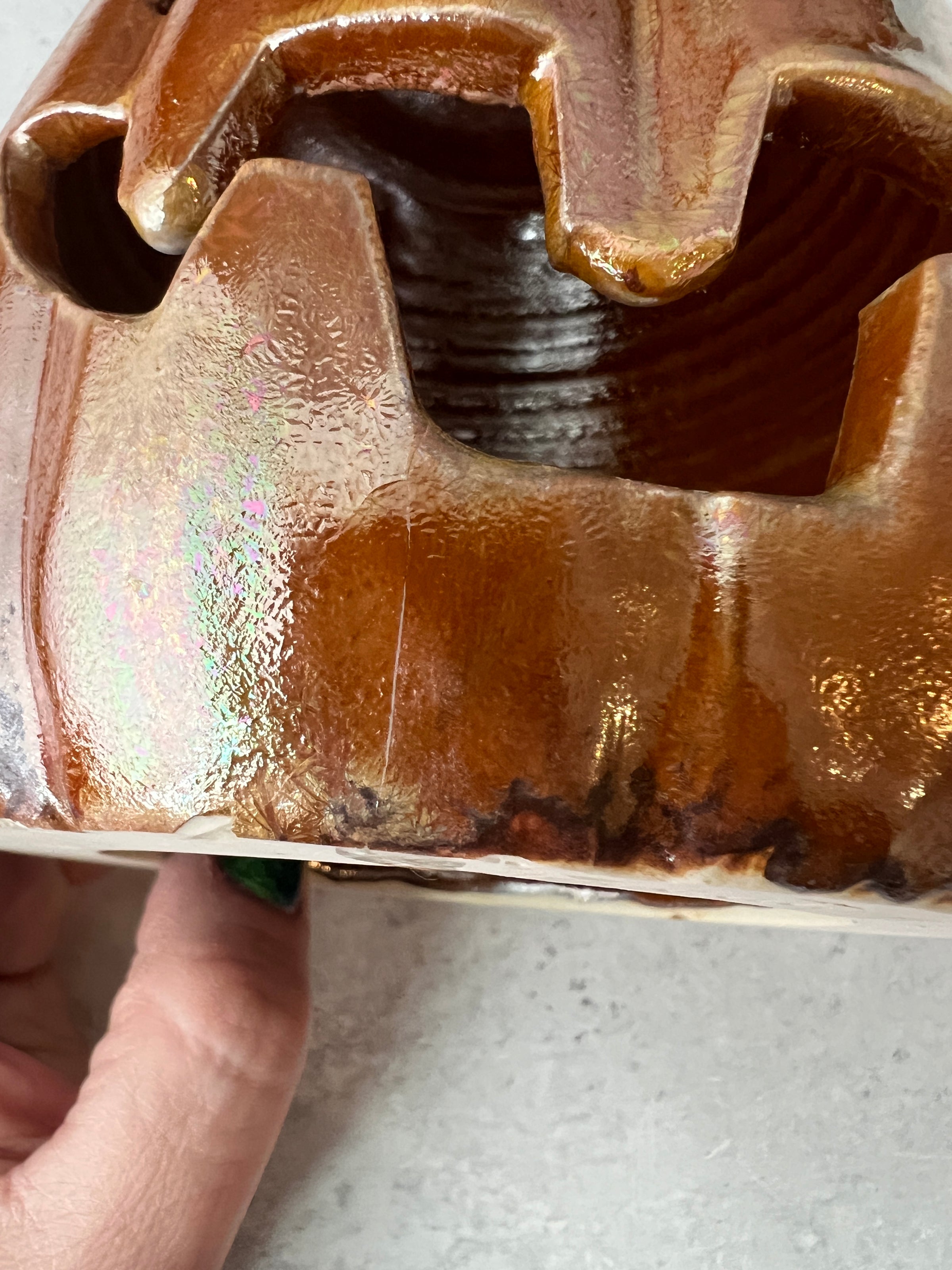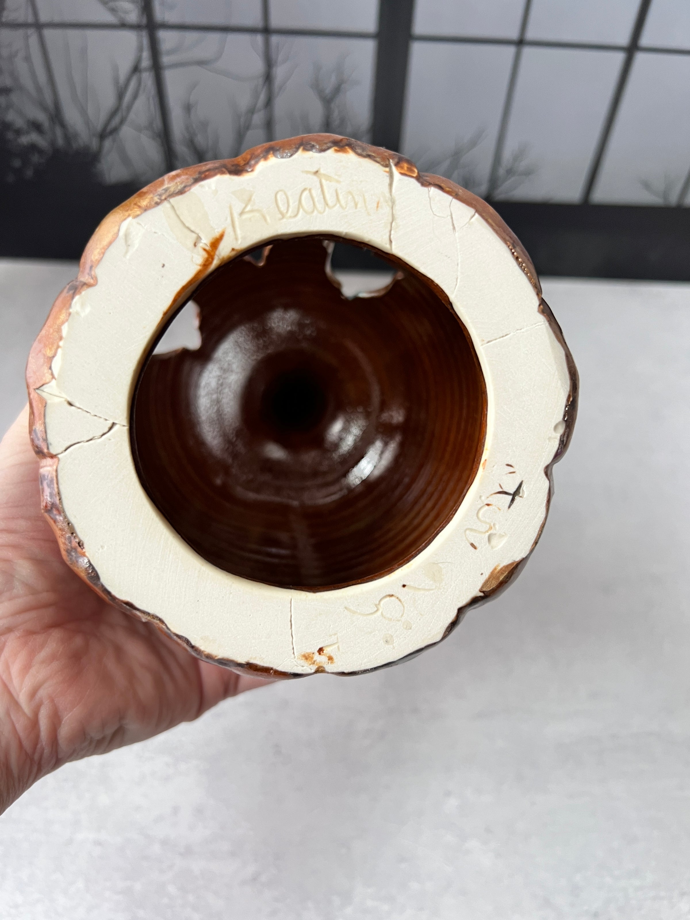 This Jack o'lantern is damaged and therefore discounted. Please see the last photos. A large piece of the mouth broke off, I glued it back on with a 2 part epoxy. There's also one small area on the side I glued a piece back on.