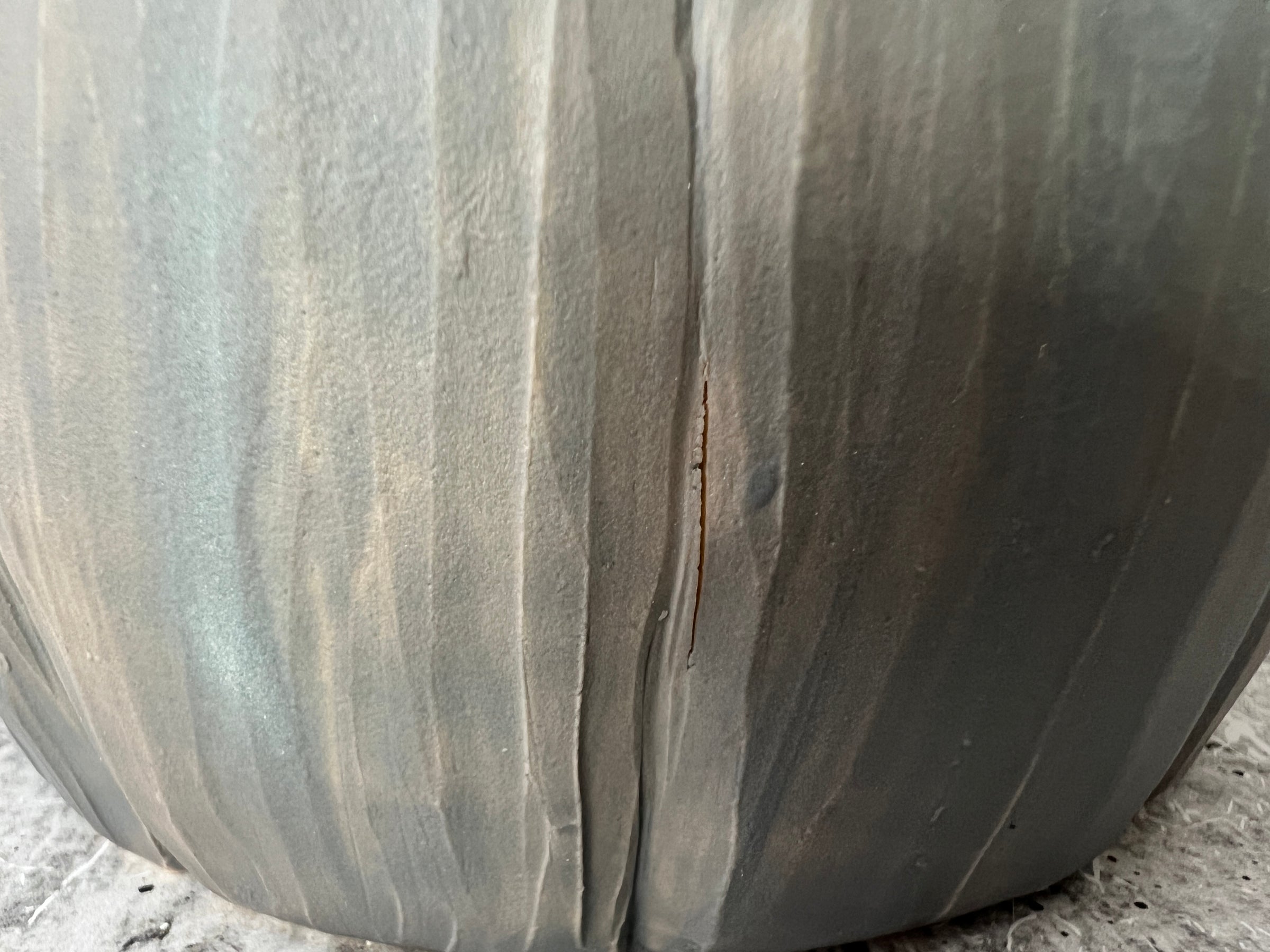 There's a small crack on the back but it does not go through to the inside. See last photo.