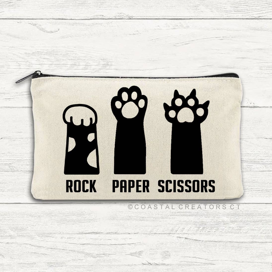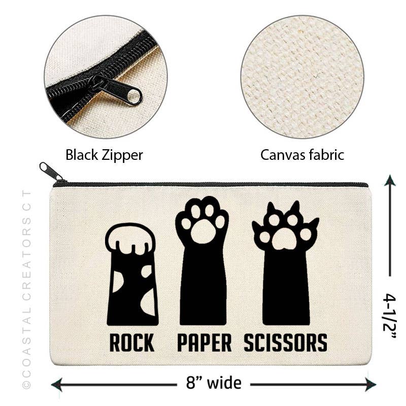 Each Cat Rock, Paper, Scissors canvas zipper bag is individually packaged with or without a header card. Bags are unlined. Fabric is light beige canvas. Zipper is black. These canvas multi-purpose zipper bags measure approximately 8" wide x 4-1/2" high and feature a cute saying or design on the front. They are perfect for pencils, beauty products, stickers, and more plus they make great impulse items for your shop. Keywords: pet shop, wholesale pet supplies, cats, cats products, cats lovers